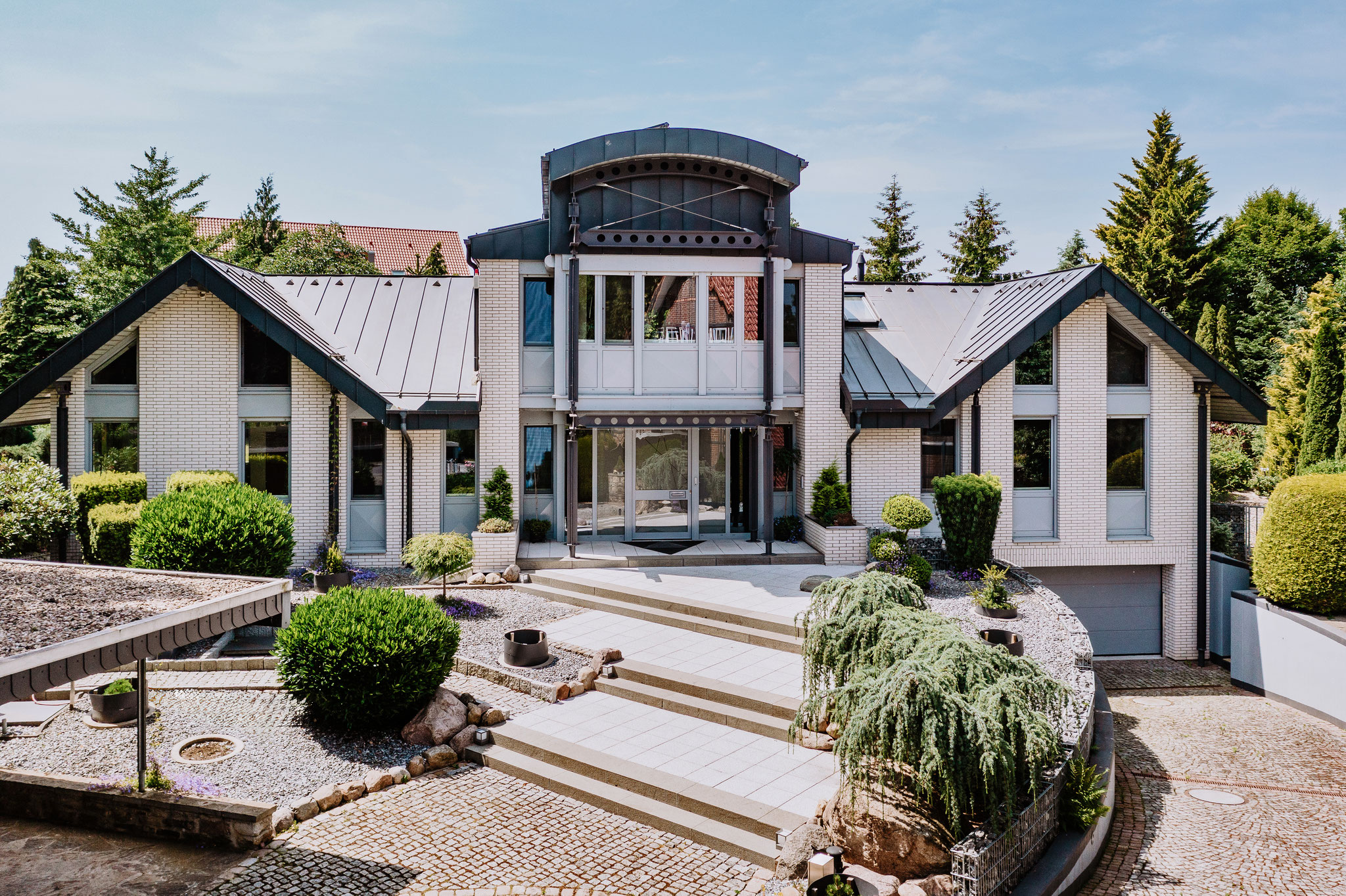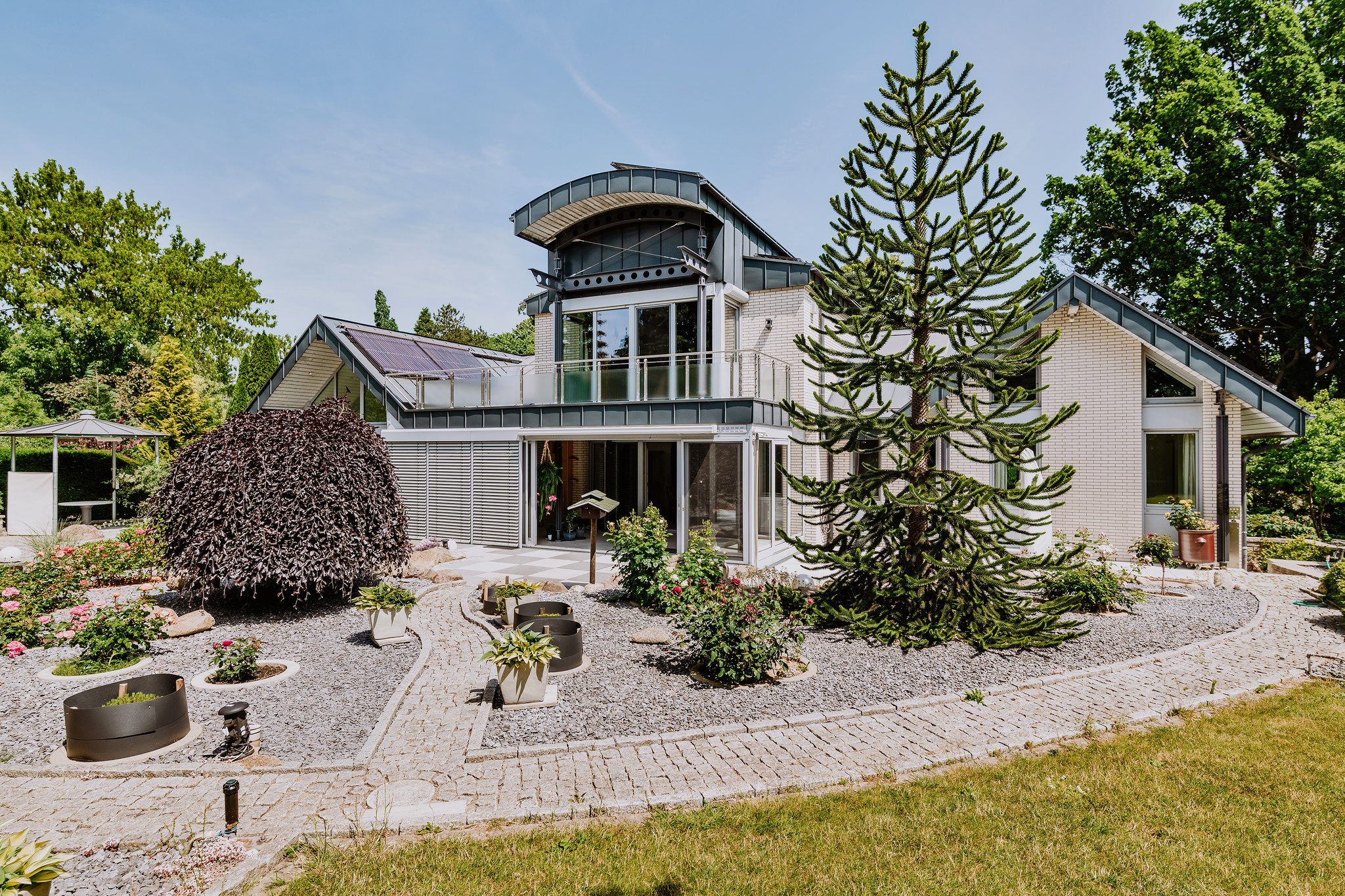 Eingebettet in eine ruhige, naturnahe Idylle präsentiert sich dieses außergewöhnliche Anwesen als wahre Rarität auf dem Immobilienmarkt – ein Refugium für Menschen mit Sinn für Architektur, Ästhetik und nachhaltige Lebensqualität. Über eine private Brücke, die sich elegant über einen kleinen Flusslauf spannt, gelangt man auf das rund 4.693 m² große, park ähnlich angelegte Grundstück – eine Welt für sich, eingefasst von altem Baumbestand und einer Atmosphäre voll natürlicher Harmonie und gehobener Privatsphäre.